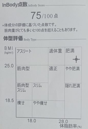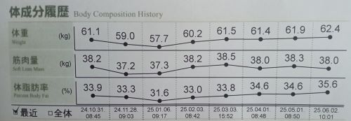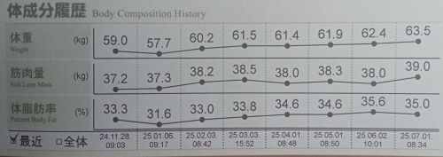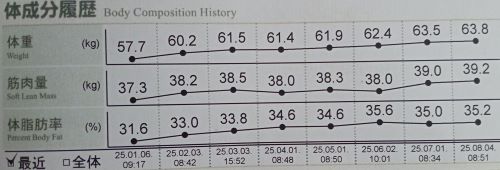 - ・体重が+1.1キロ、筋肉量が+1.0キロ、体脂肪率が-0.6%でした。