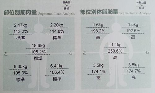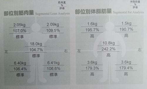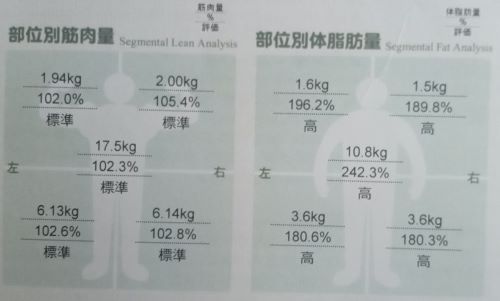 ・前回と変わらず筋肉量は全て<標準>、脂肪量は全て<高>です(涙)