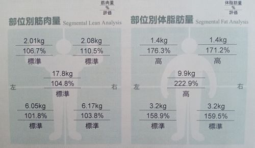 ・筋肉量は全て<標準>、脂肪量は両腕、体幹は<高>のままだけど、両足が<標準>になりました!