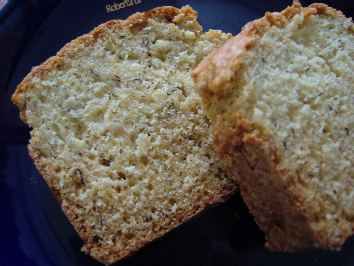 | バナナとごまの意外な組合わせですが、香ばしく栄養満点のケーキ風パンです。一見パウンドケーキのようですが、強力粉を使っているのでしっとりしたパンで、おやつはもちろん、休日の朝食にもおすすめです。冷凍保存もOKです。 |