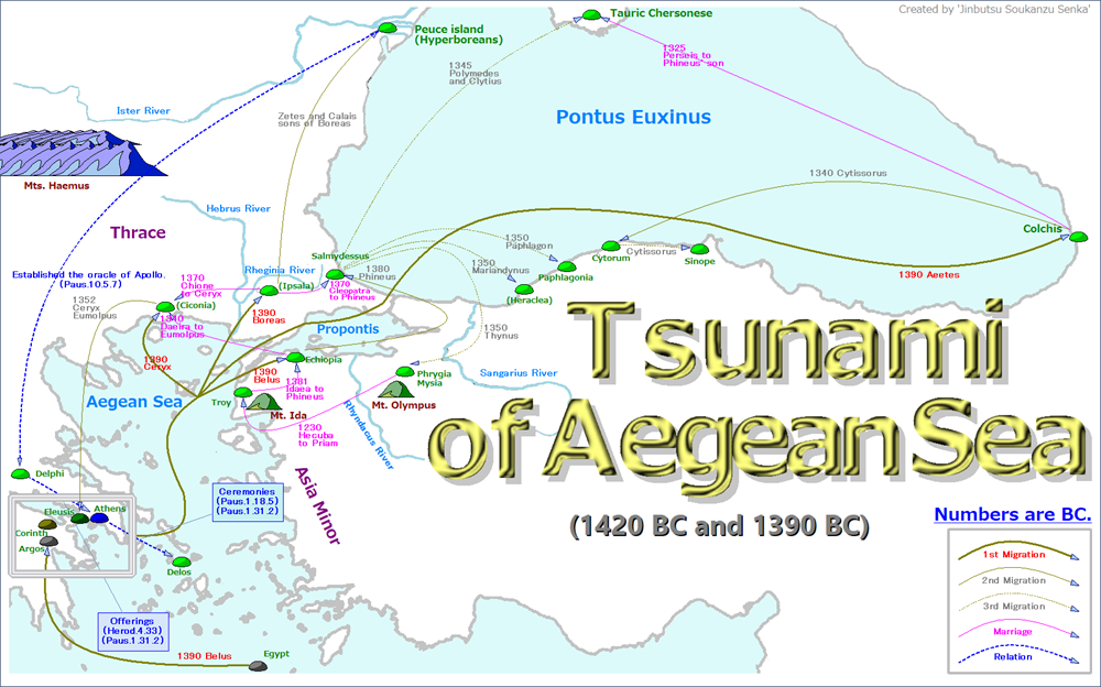 The tsunami also struck the Pelasgians, a group living along the coast of Thessaly. Lost in their homes, the Pelasgians migrated inland en masse and attacked Itonus, near Halus.