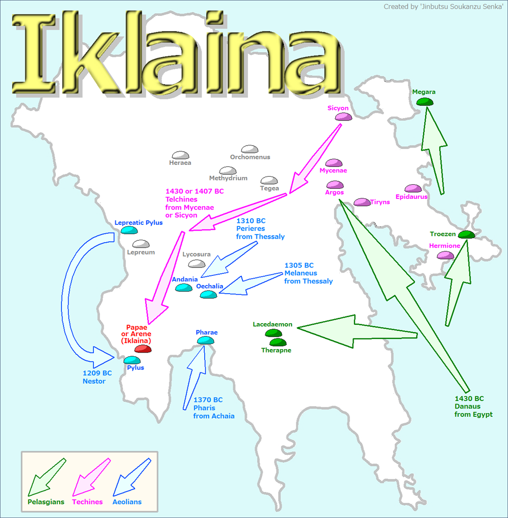 In 1430 BC, Danaus, son of Belus, migrated from Egypt to the Peloponnesus. Danaus occupied Agros, destroyed Mycenae, and expelled the Telchines. [171]