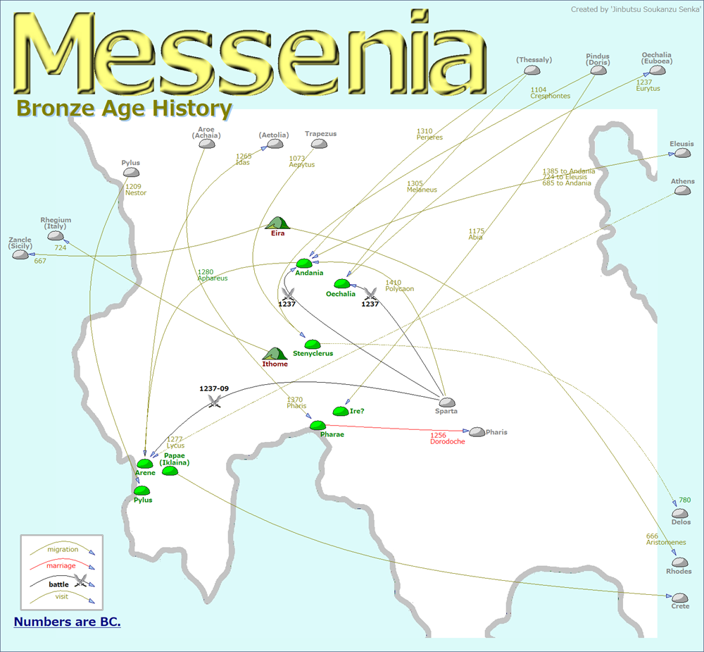 In 1310 BC, Perieres, son of Aeolus, son of Lapithes, migrated from Thessaly to Messenia and inherited Andania.[177]