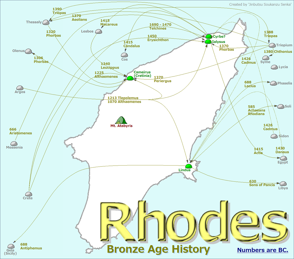 Danaus and Cadmus, mentioned below, stopped off at Rhodes before coming to Greece from Egypt and Phoenicia.