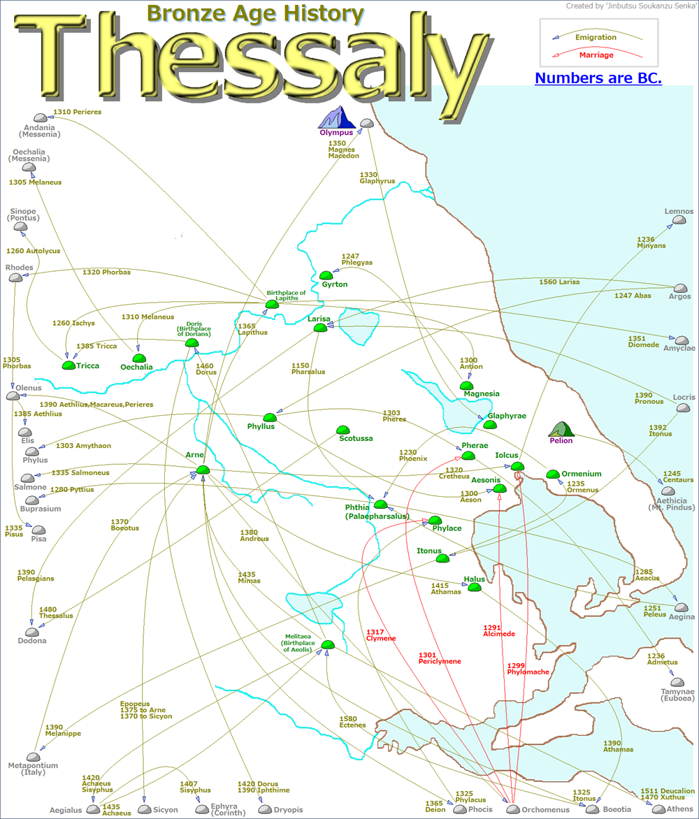 These legends do not seem to relate to the time when Pelasgus' daughter Larisa migrated from Argos to Thessaly in 1560 BC.