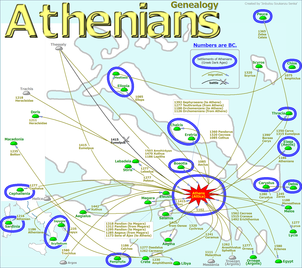 In 1277 BC, the Athenians who lived in Attica migrated to Argolis, Boeotia, Phocis, Arcadia, Lycia, and Crete.