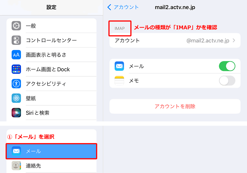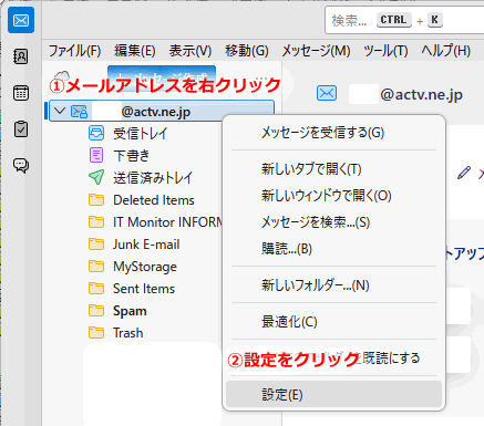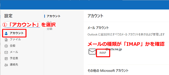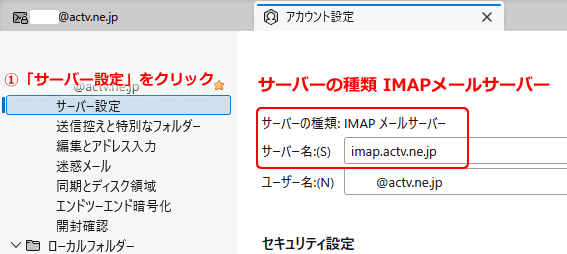 (今回の対象)IMAP受信:[ imap.actv.ne.jp ] または [ imap2.actv.ne.jp ] の設定になっているかを確認します。