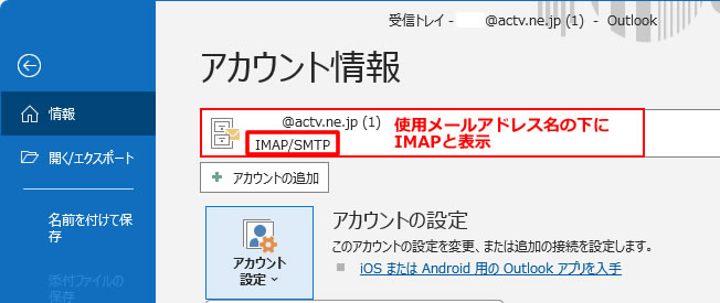 「ファイル」-「情報」で表示されたアカウント情報を確認