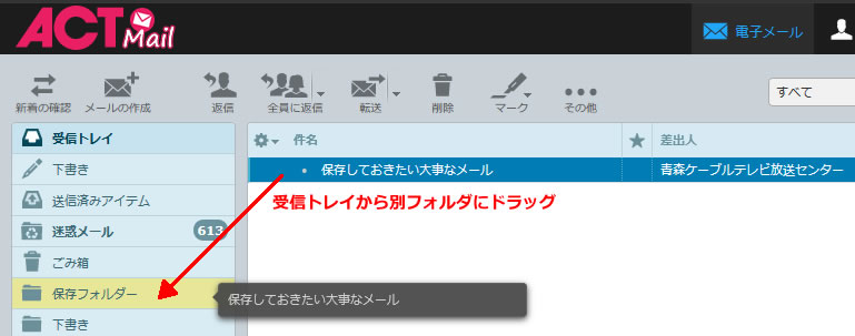 必要メールを「受信トレイ」から「保存フォルダー」など別フォルダに移動してください。