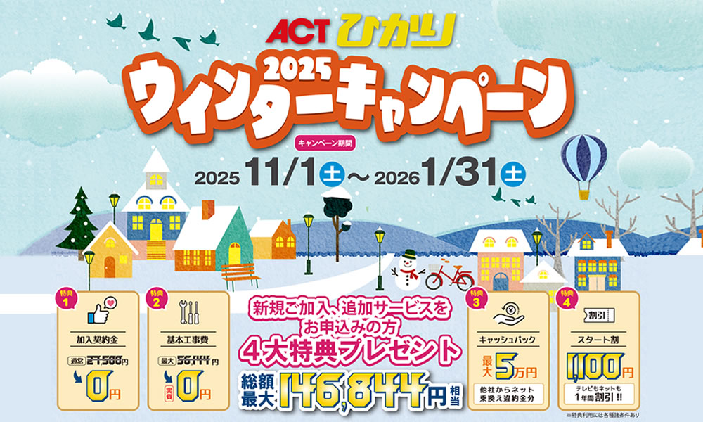 ACTひかり ウインターキャンペーン ~2026年1月31日まで 2025 10/31 お知らせ キャンペーン 2025年10月31日 キャンペーン概要 各種サービス案内 ひかりケーブルテレビ ひかりインターネット ケーブルプラス電話 ひかりサービス料金 お申込み代理店 お申込み・お問い合わせ お知らせ キャンペーン